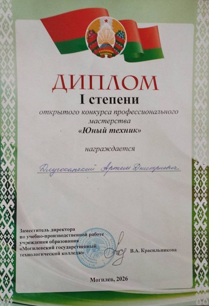 11 марта 2026 года наши учащиеся посетил Могилевский Государственный Технологический Колледж для принятия участие в конкурсе «Юный техник». Конкурс был устроен в 2 этапа. Первый этап теоретический и второй — практический. Первое место получил Длугоканский Артем, учащийся 9 Г класса