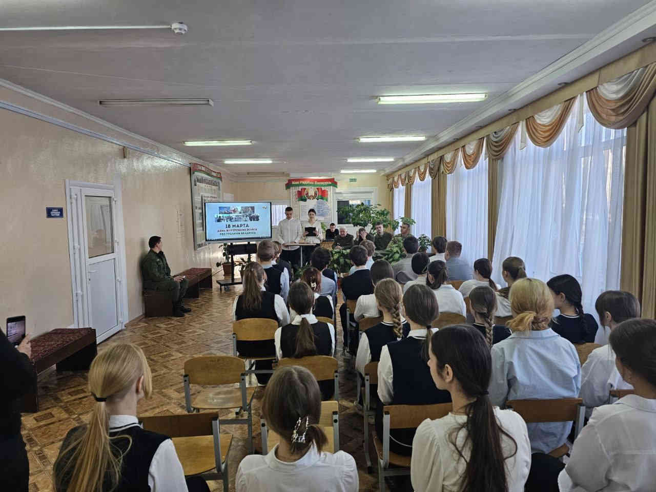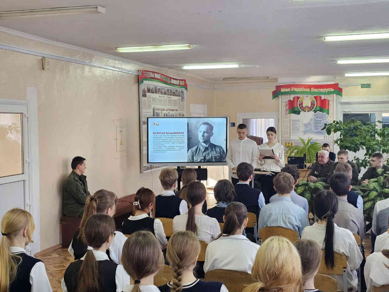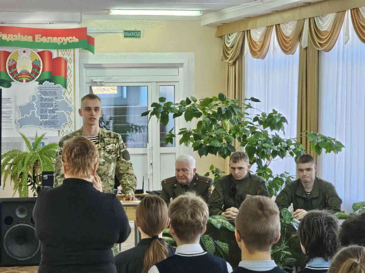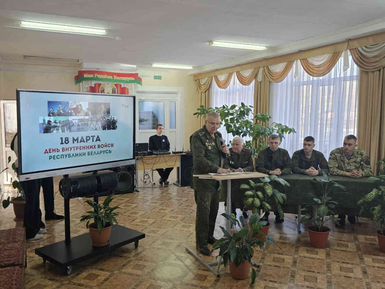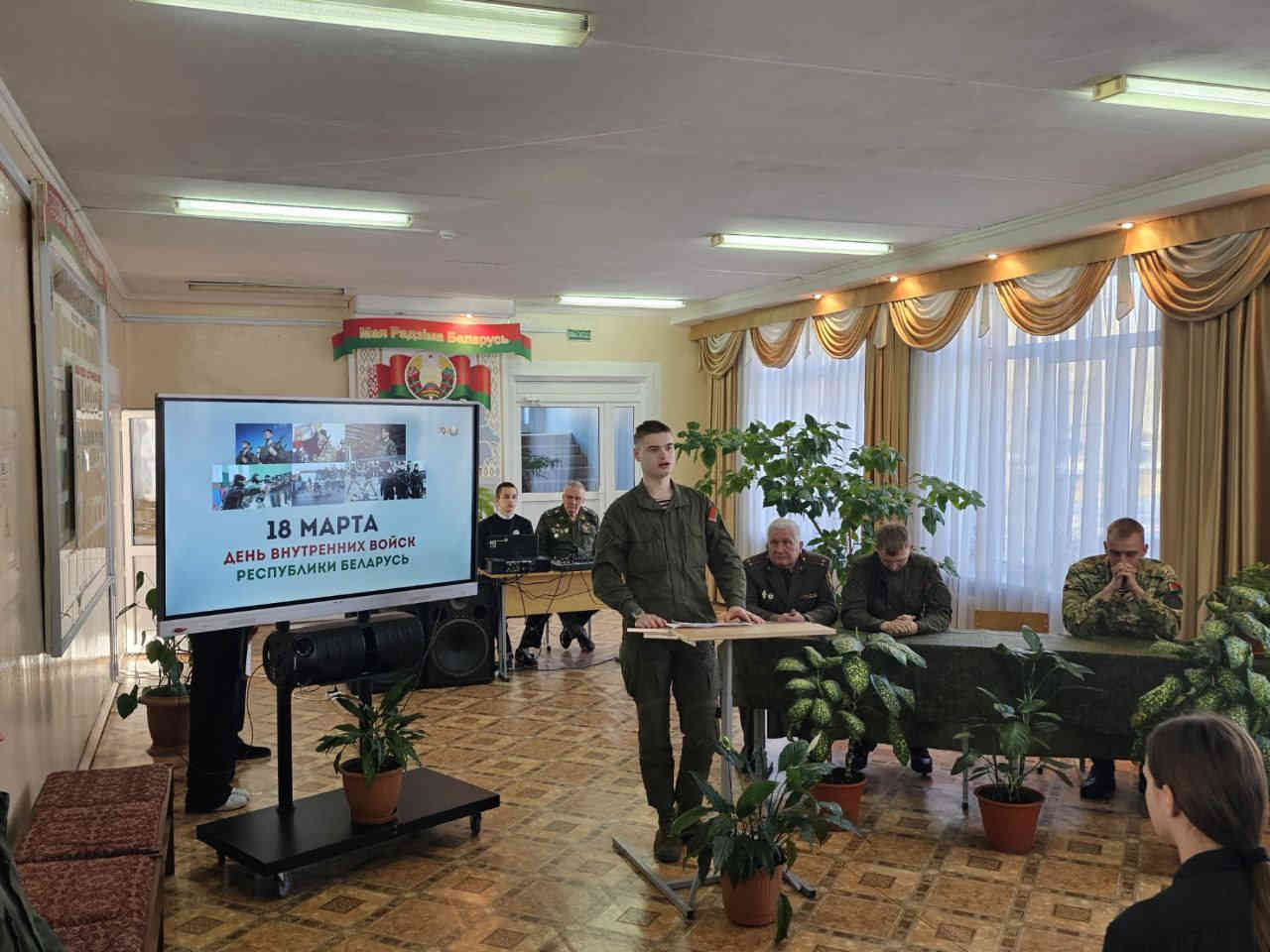 19 марта учащиеся 10 класса приняли участие в мероприятии Центра Допризывной Подготовки, приуроченном к празднованию дня внутренних войск МВД Республики Беларусь «Никто кроме нас! Долг! Честь! Отечество!». На мероприятии присутствовали гости из В/Ч 6713, а именно действующий офицер и 2 курсанта. 1 из курсантов имеет краповый берет. Также на мероприятии присутствовал воин-интернационалист, прошедший Афганскую войну — Тимофеев Виктор Александрович. Сотрудники поделились своим опытом и тяготами службы, с которыми они успешно справляются по сей день.