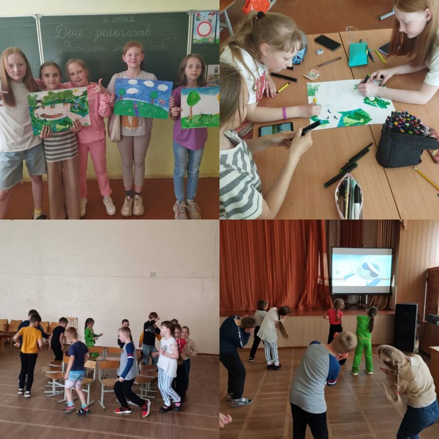 2 июня 2023 года в оздоровительном лагере прошёл День знакомств под девизом «Расскажи мне о себе». Педагог-организатор Цырук О.О. провела игру «Давайте познакомимся», где ребята познакомились друг с другом. Затем ребята посетили школьную библиотеку, где для них прошло увлекательное путешествие «В гостях у лета». В спортивном зале были проведены весёлые старты «Богатырские забавы». Это было яркое, эмоциональное зрелище, праздник радости, здоровья, успеха. Спортивному соревнованию сопутствовал задор и спортивный азарт школьников. Кроме этого, ребята побывали на музыкальном занятии, где поучаствовали в танцевально – игровом развлечении «Путешествие в мире танца». В актовом зале прошел киноурок «Время патриотов» в рамках республиканского киномарафона «Смотри и помни», где ребята просмотрели видеоролик «Геноцид. Дело№». Окончанием сегодняшнего дня стало посещение театра кукол, где ребята увидели представление «Самый маленький самолет на свете».