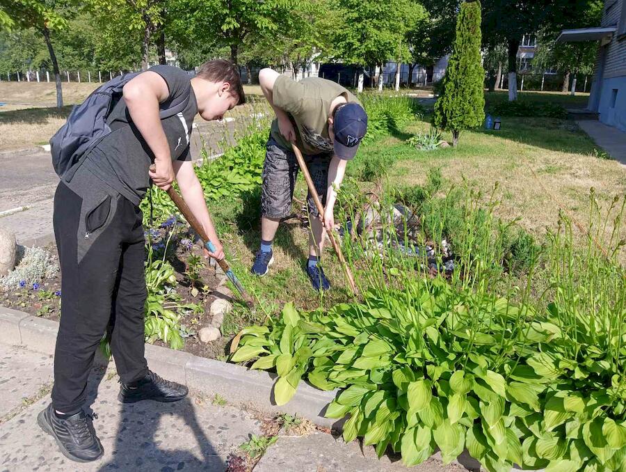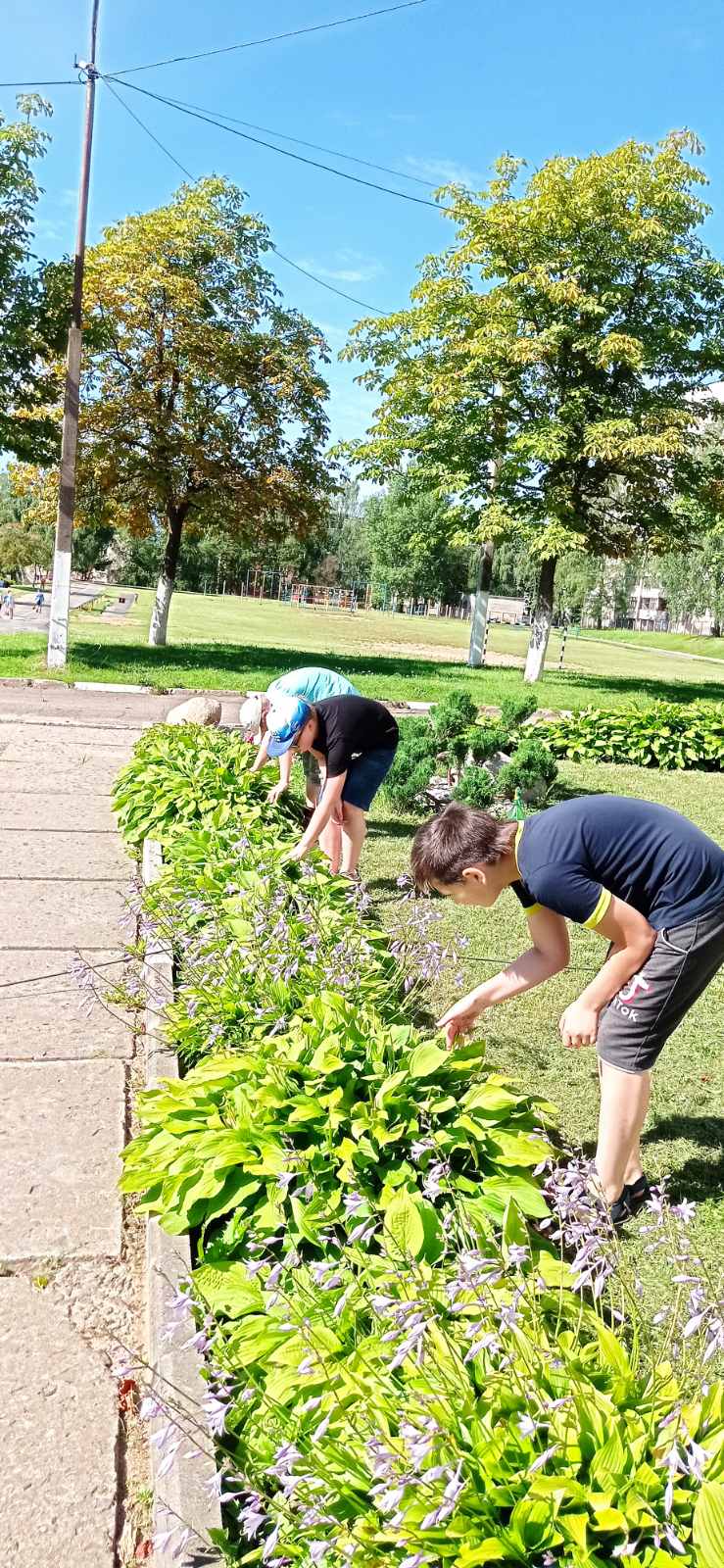 Сегодня 3 августа 2023 года в рамках работы экоклуба "Зелёный след" учащиеся осуществляли удаление сухих листьев и обрезку сухих ветвей растений, помогали убирать скошенную газонную траву.