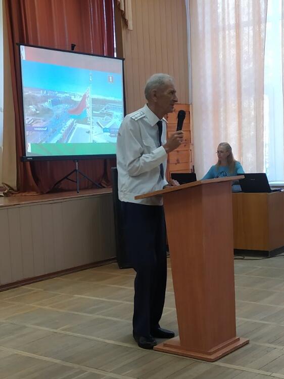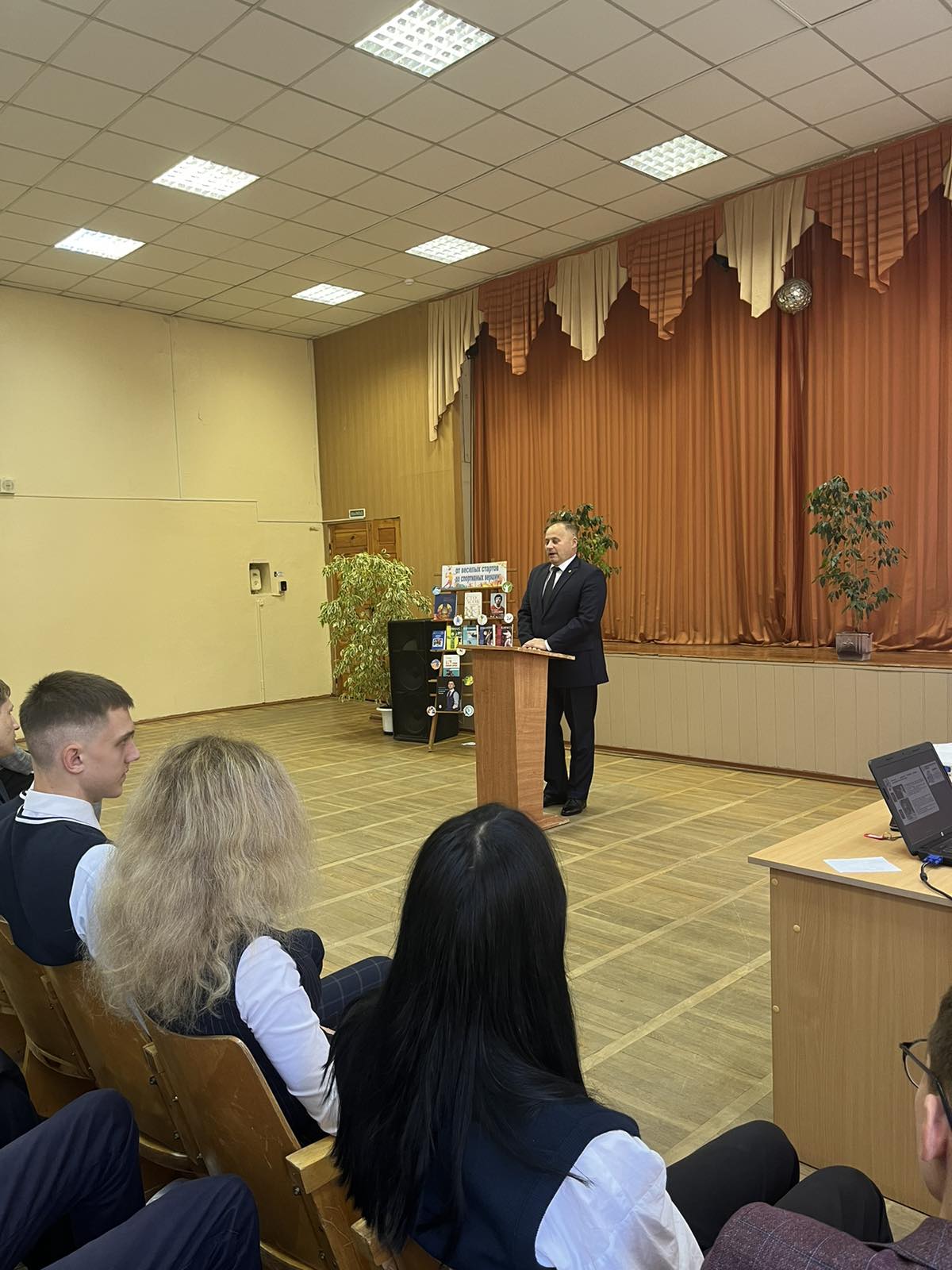 Поздравить учащихся пришел председатель комиссии по патриотическому воспитанию молодежи, член президиума Совета ветеранов, а также Ветеран Вооруженных Сил - Данилин Геннадий Николаевич.