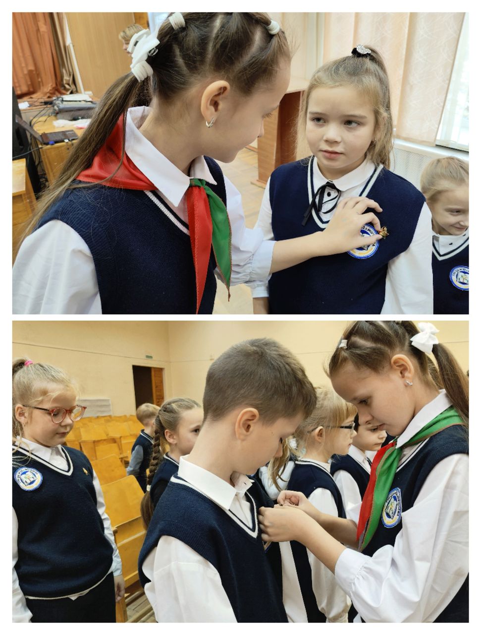27 октября 2023 года прошло торжественное принятие учащихся второго класса в октябрята. Это первая ступенька Белорусской республиканской пионерской организации. Прежде чем на груди у каждого засияла звездочка – отличительный знак октябренка, ребята участвовали в различных конкурсах. Согласно условиям, надо было ответить на вопросы: про Родину, природу Беларуси, угадать мелодию и рассказать правила октябрят. После всех этапов конкурса настал самый долгожданный момент – члены пионерской дружины и БРСМ вручили второклассникам звездочки.