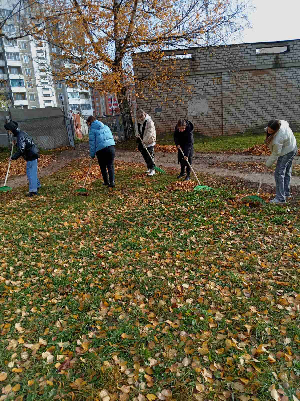 учащиеся 10 класса с хорошим настроением работали на школьной территории