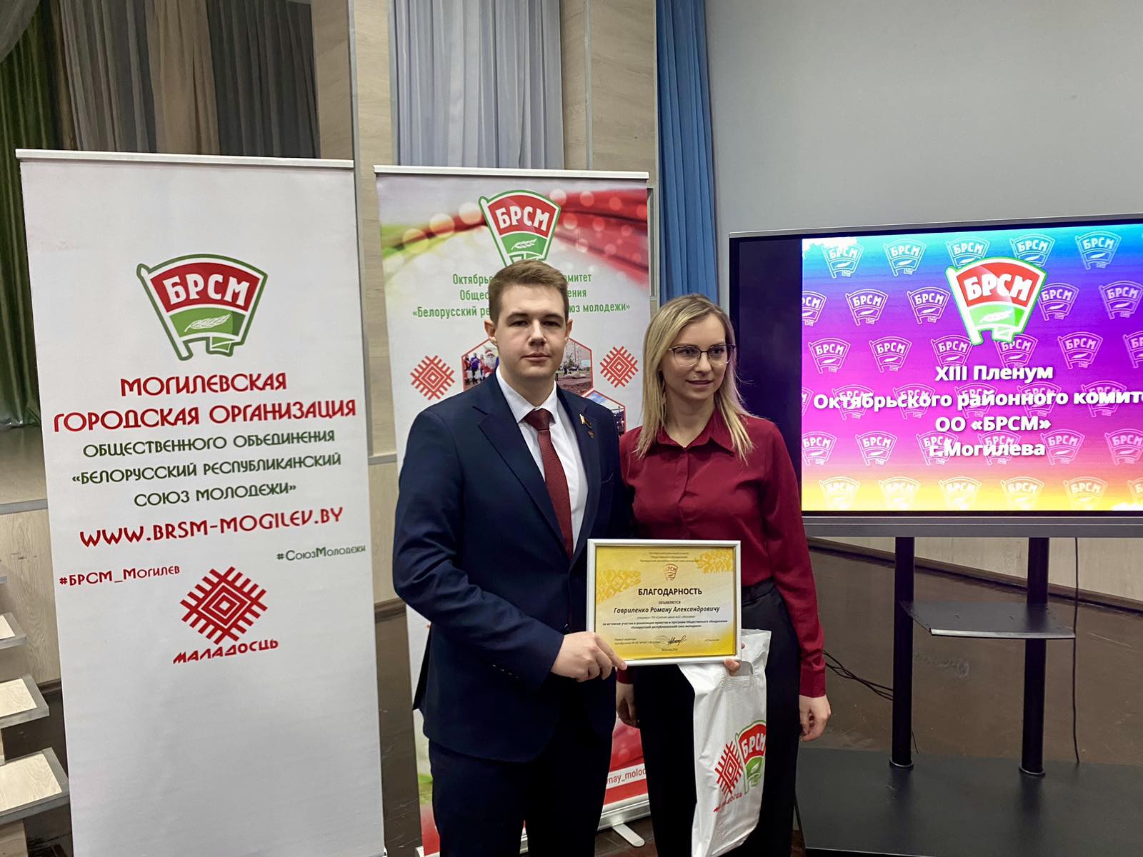 6 февраля 2024 года учащиеся 11А класса Гавриленко Роман и Данилов Иван приняли участие в XIII Пленуме Октябрьского районного комитета ОО БРСМ. В ходе проведения с отчётом о деятельности выступили РК и ГУО "Средняя школа №38 г. Могилева" за 2023 год. Также наш учащийся Гавриленко Роман, заместитель секретаря ПО ОО БРСМ им. Романова, был отмечен благодарностью первого секретаря Октябрьского РК ОО БРСМ Аниченко А.О. за активное участие в реализации проектов и программ Общественного объединения «Белорусский республиканский союз молодежи».
