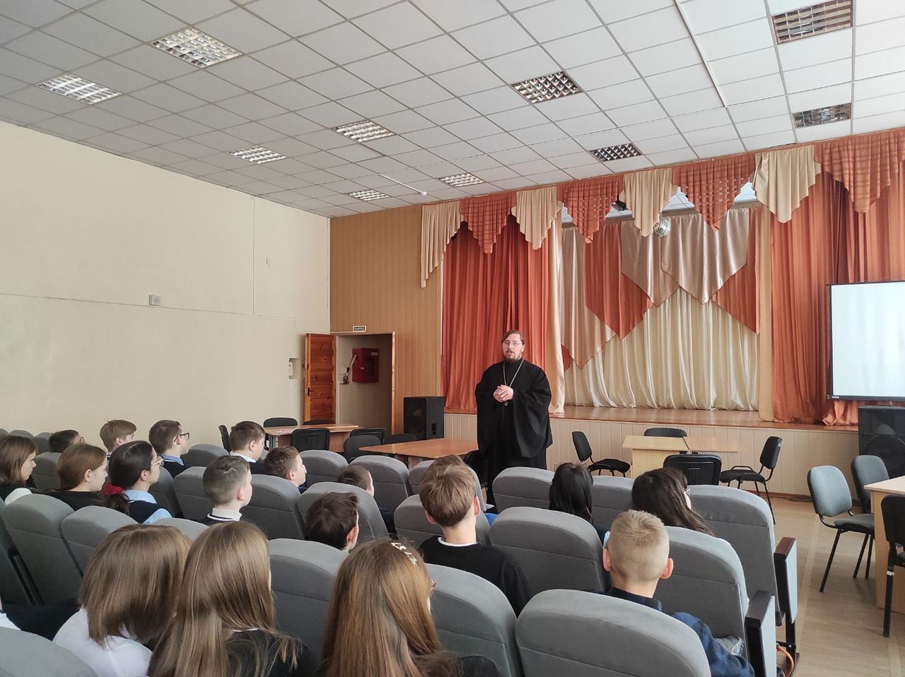 16 февраля 2024 года в школе состоялась встреча священнослужителя Скоб Алексея Николаевича из Храма святых праведных Иокима и Анны с учащимися 7-8 классов на тему "Поступки и их влияние на нашу жизнь". Цель встречи: научить учащихся обдумывать свои поступки, контролировать себя, свои действия и эмоции. Встреча прошла в позитивной атмосфере, учащиеся узнали как важно воспитывать в себе стремление совершать добрые дела и хорошие поступки.