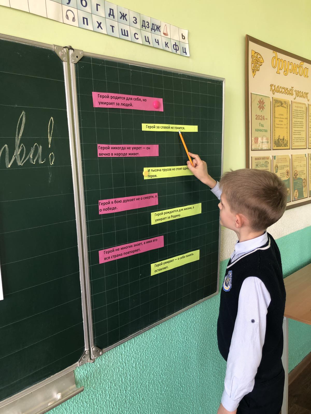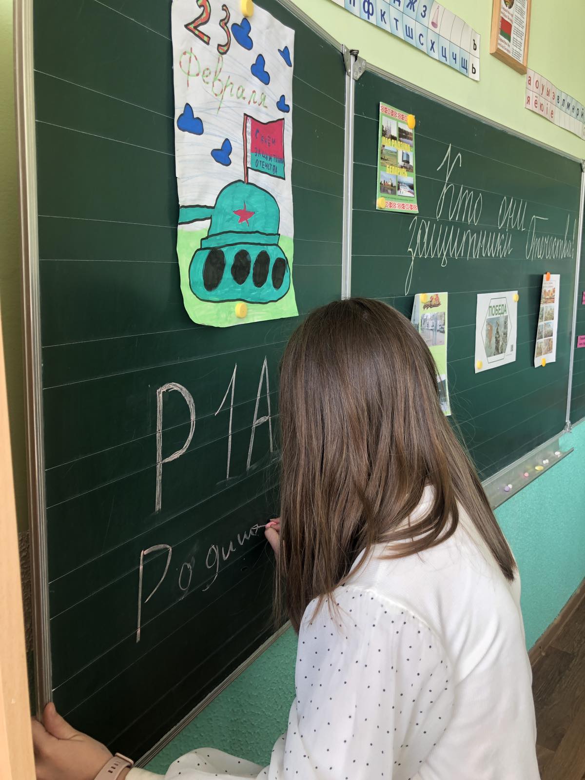 21 февраля 2024 года в 4 «Г» классе прошел открытый классный час посвященный теме: «Кто они - защитники Отечества!». Целью классного часа являлось развитие нравственности, ознакомление с историей Беларуси и ее героями, воспитание любви и патриотизма к Родине. В ходе классного часа, учащиеся ознакомились с понятием «Защитник Отечества» и современными героями Беларуси; разгадывали ребусы и собирали пословицы.