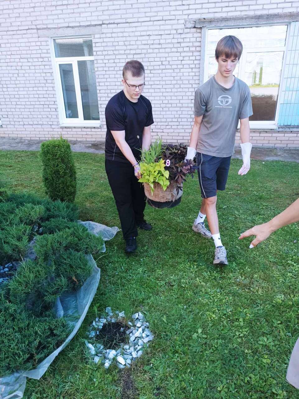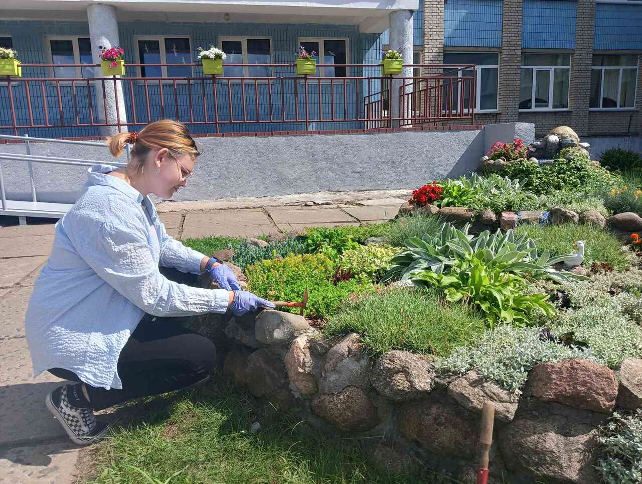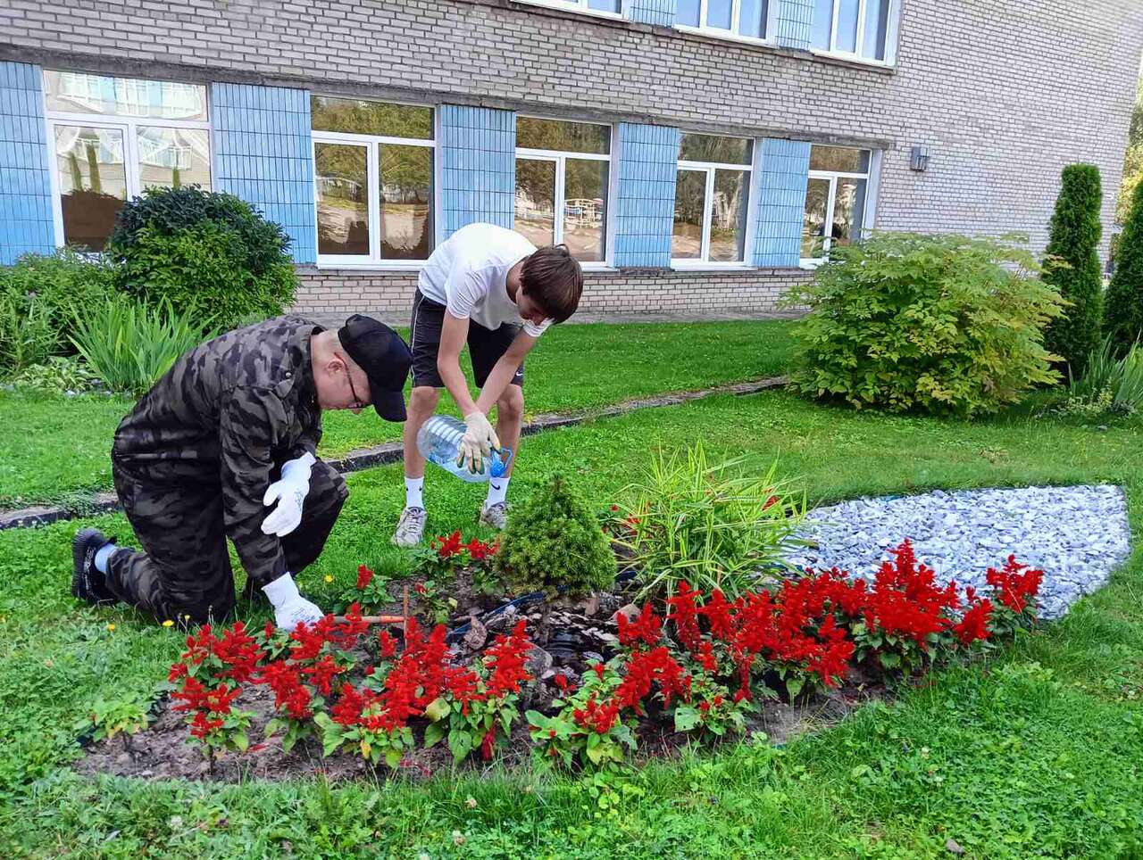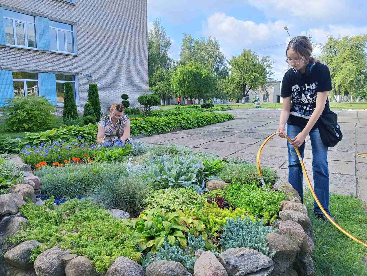 13.08.2024 в рамках работы экоклуба "Зеленый след" учащиеся оказали помощь в уходе за ландшафтной композицией "Сухой ручей", а также в поливе растений на территории школы.