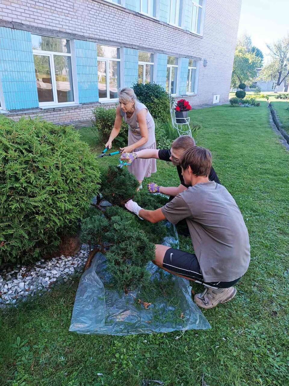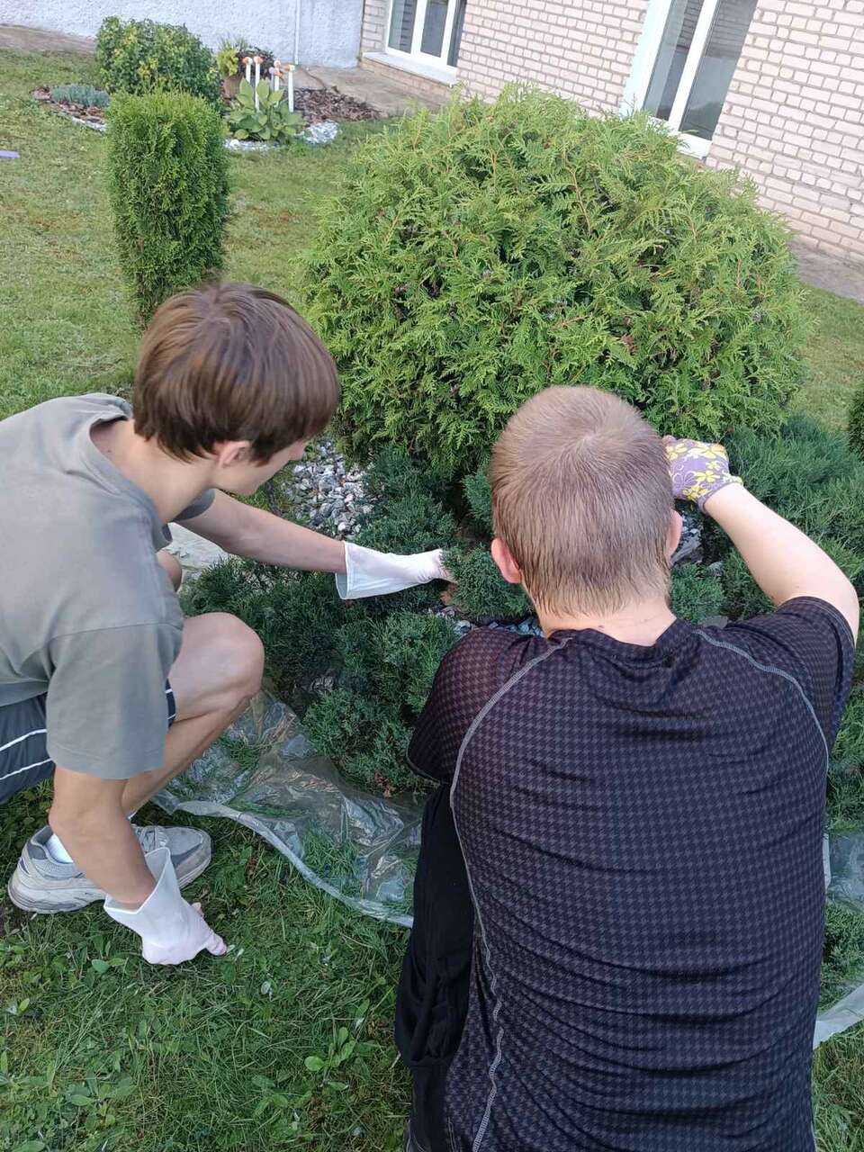 Сегодня, 16.08.2024 года, в рамках работы экоклуба " Зелёный след" ребята оказывали помощь в стрижке туй и можжевельника, убирали остриженную хвою, помогали поливать растения.