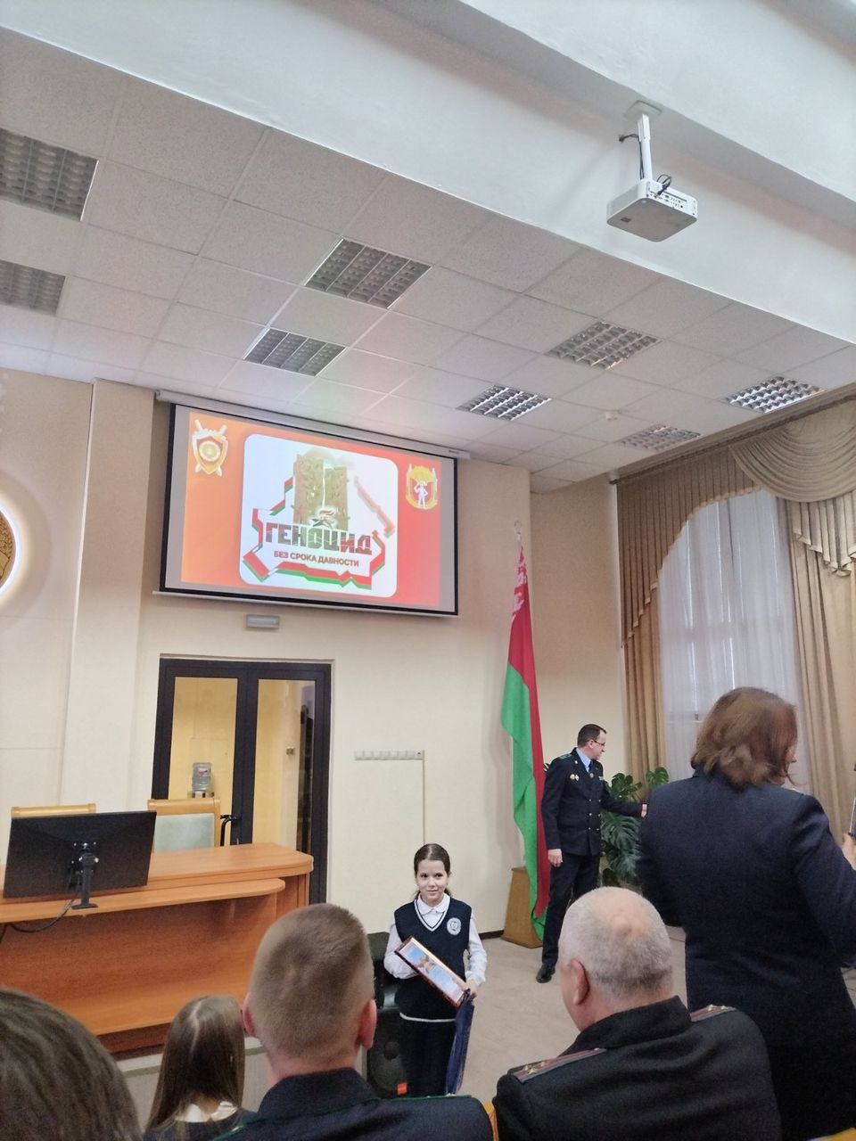 11 декабря 2024 года в прокуратуре Могилевской области состоялось награждение победителей областного конкурса эссе,"Без срока давности", посвящённого Международному дню памяти жертв преступлений геноцида. Учащаяся 5" Б"класса Сафонова Вероника диплом 2 степени в возрастной группе от 8 до 14 лет.