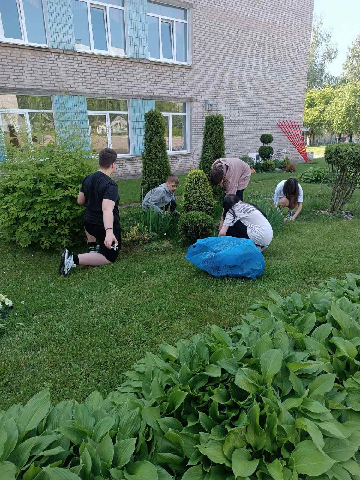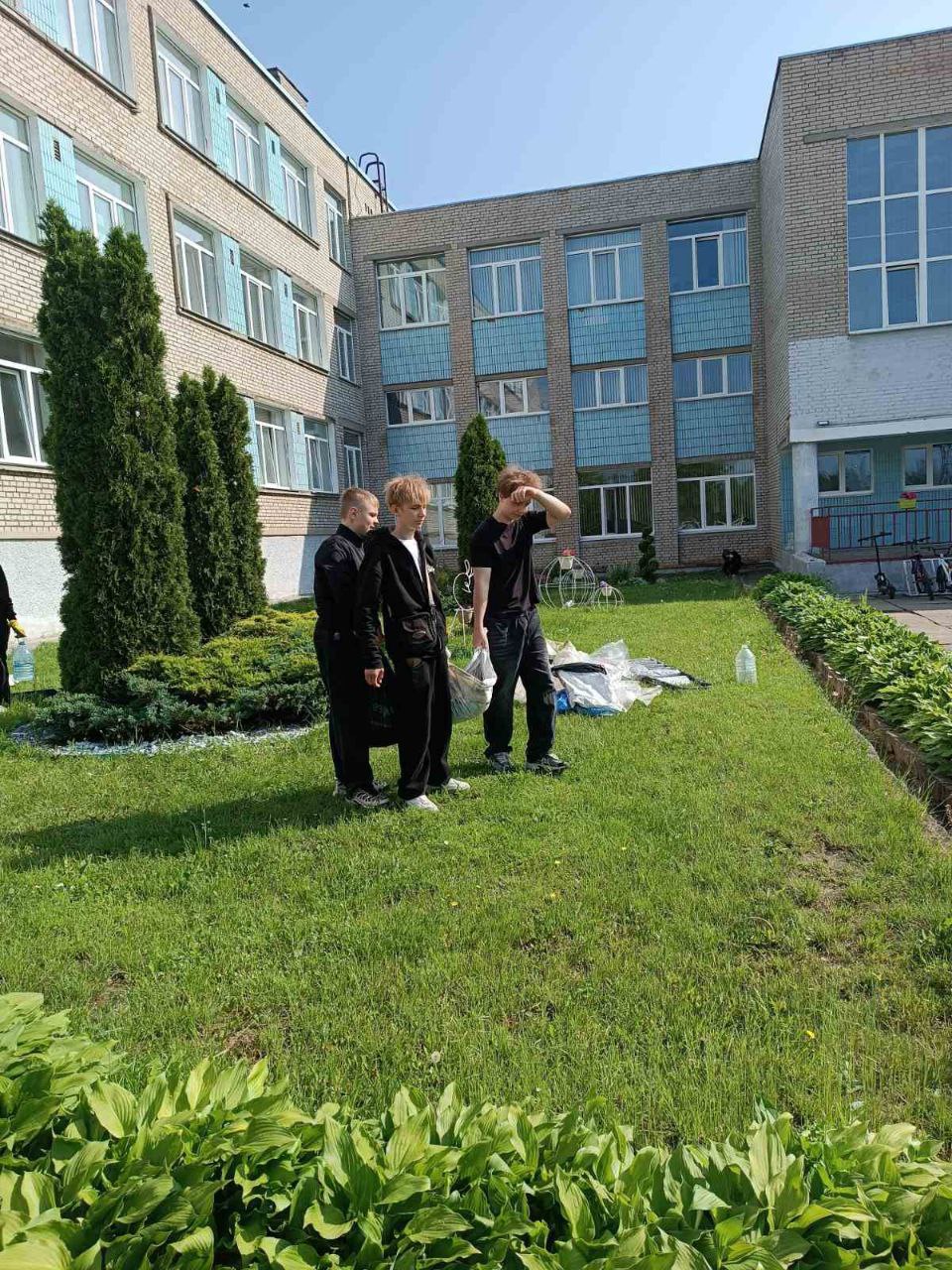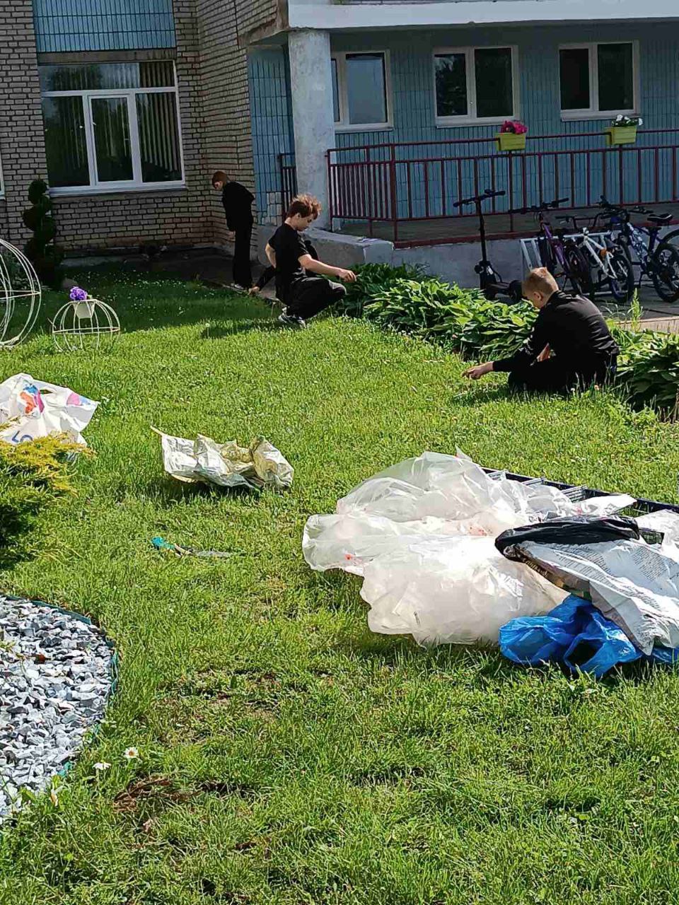 18 июня 2025 года в рамках работы экоклуба «Зелёный след» ребята работали на территории школы: помогали в обрезке травы и уборке клумб.