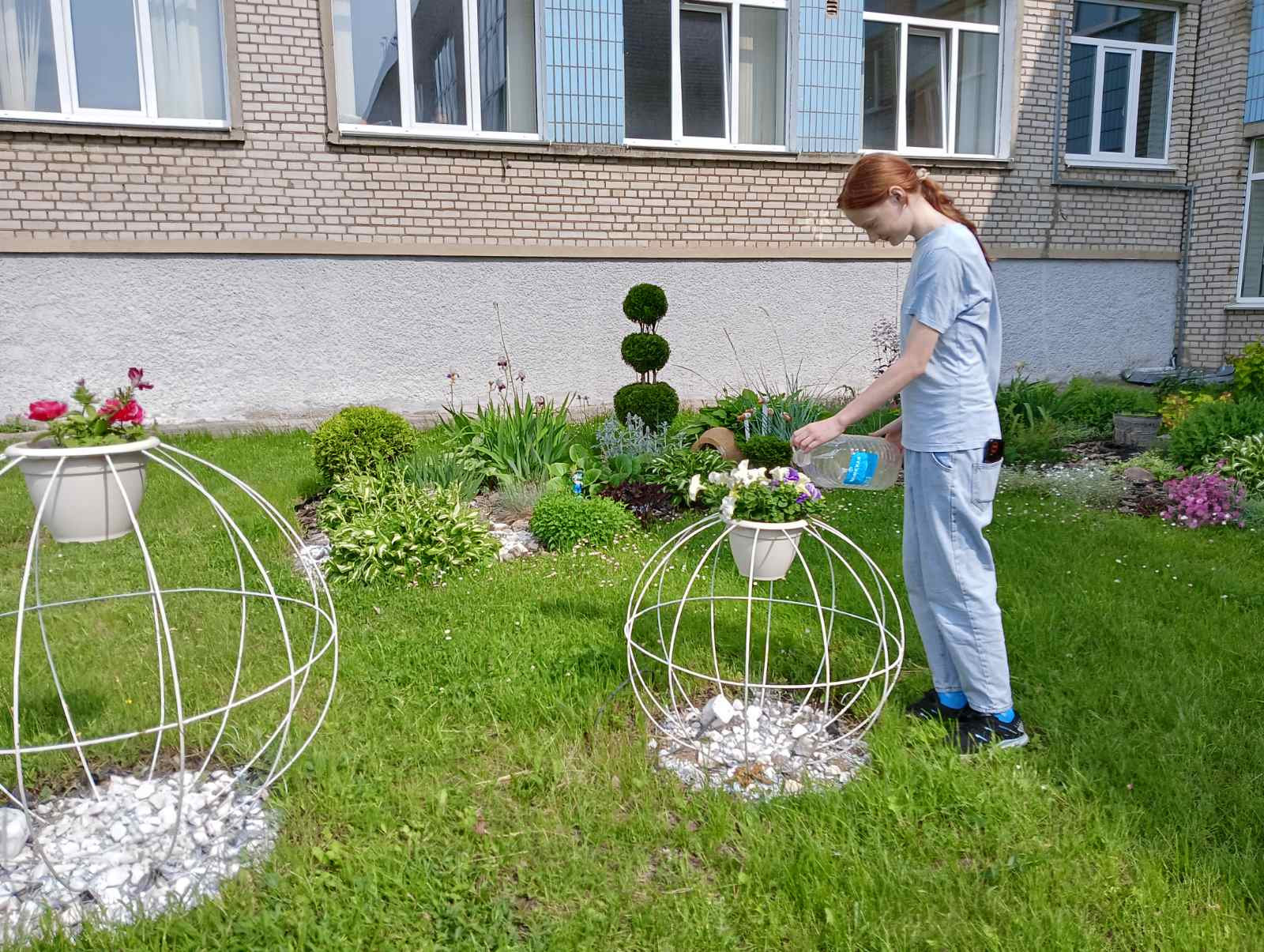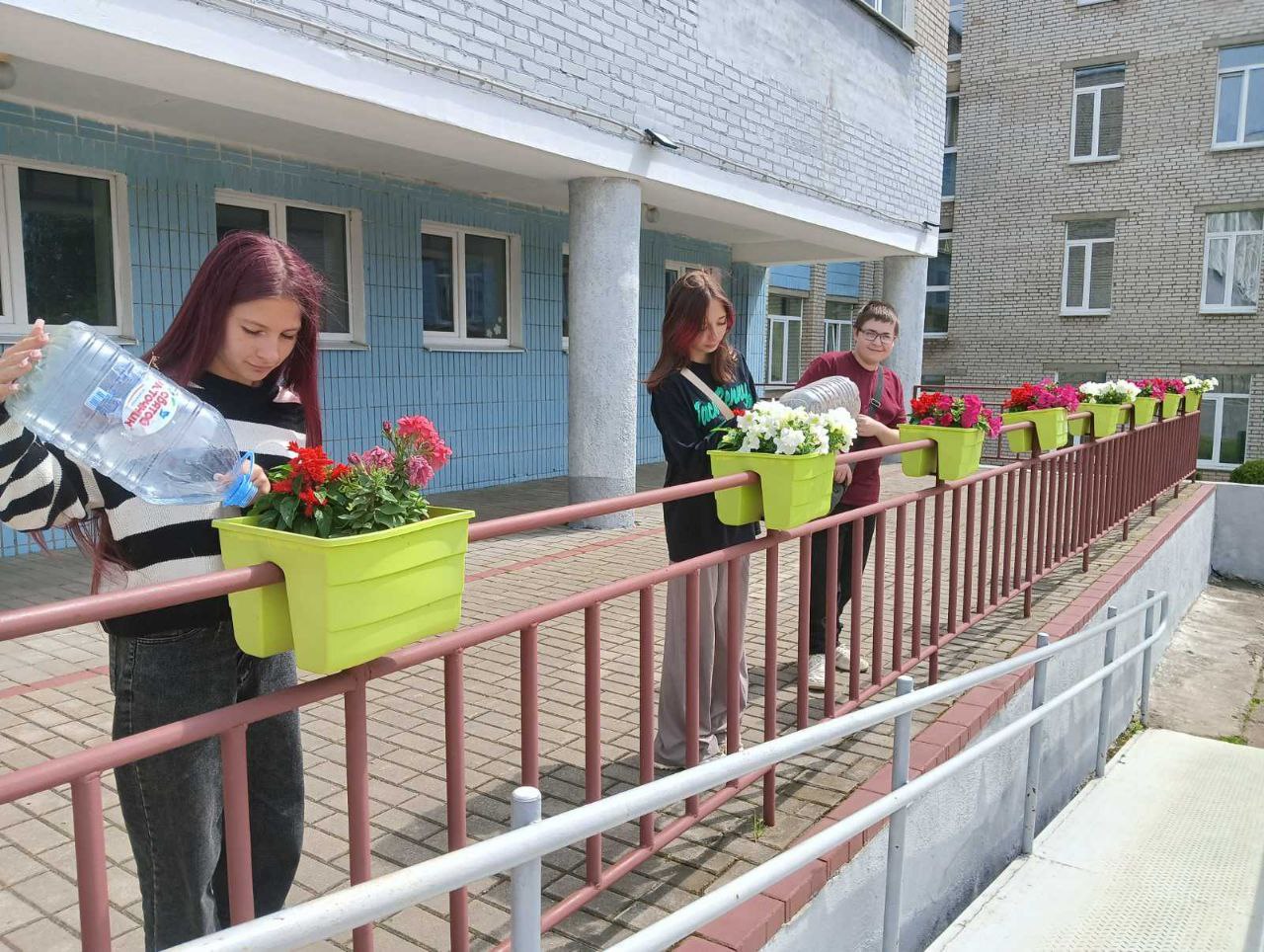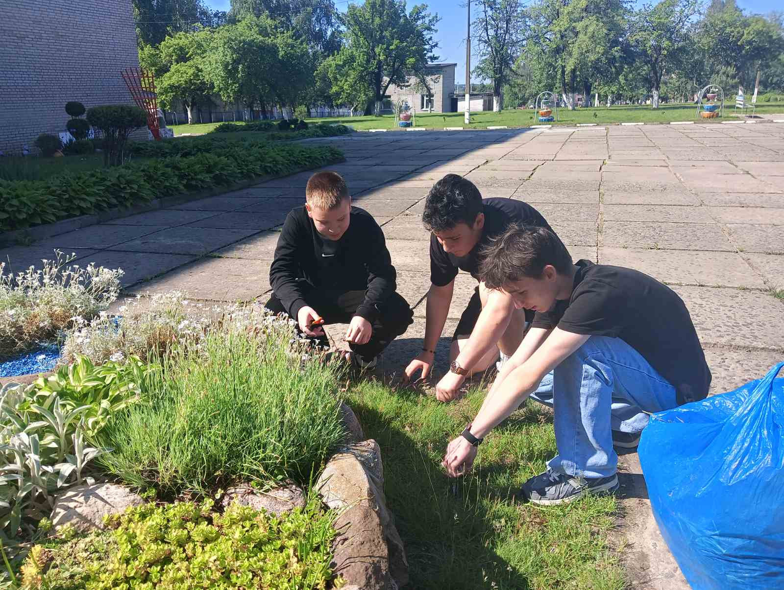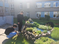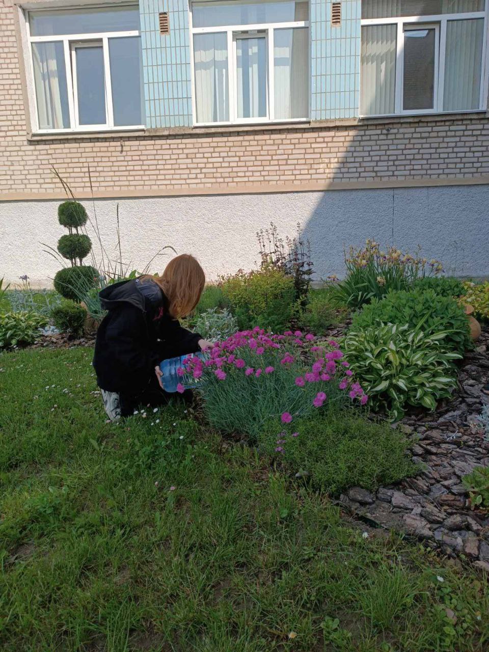 в рамках работы экоклуба "Зеленый след" учащиеся продолжили работу по уходу за клумбами: обрезка отцветших растений и их полив.